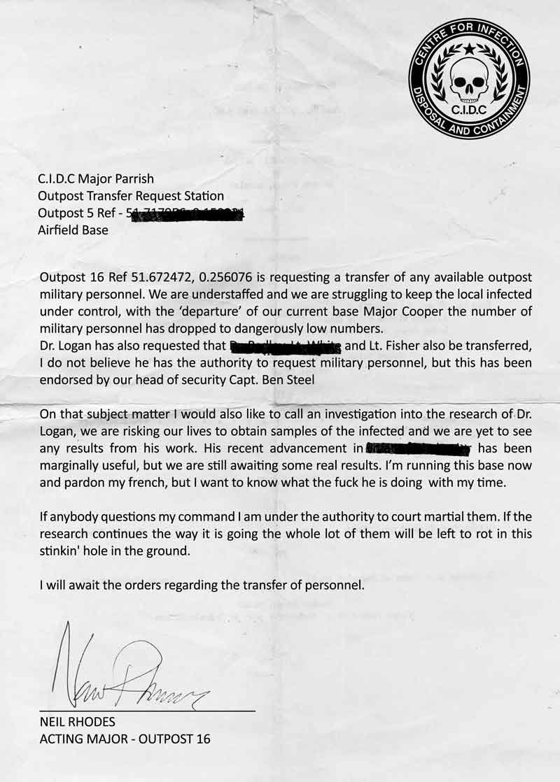 Outpost 16 Ref 51.672472, 0.256076 is requesting a transfer of any available outpost military personnel. We are understaffed and we are struggling to keep the local infected under control, with the ‘departure’ of our current base Major Cooper the number of military personnel has dropped to dangerously low numbers.