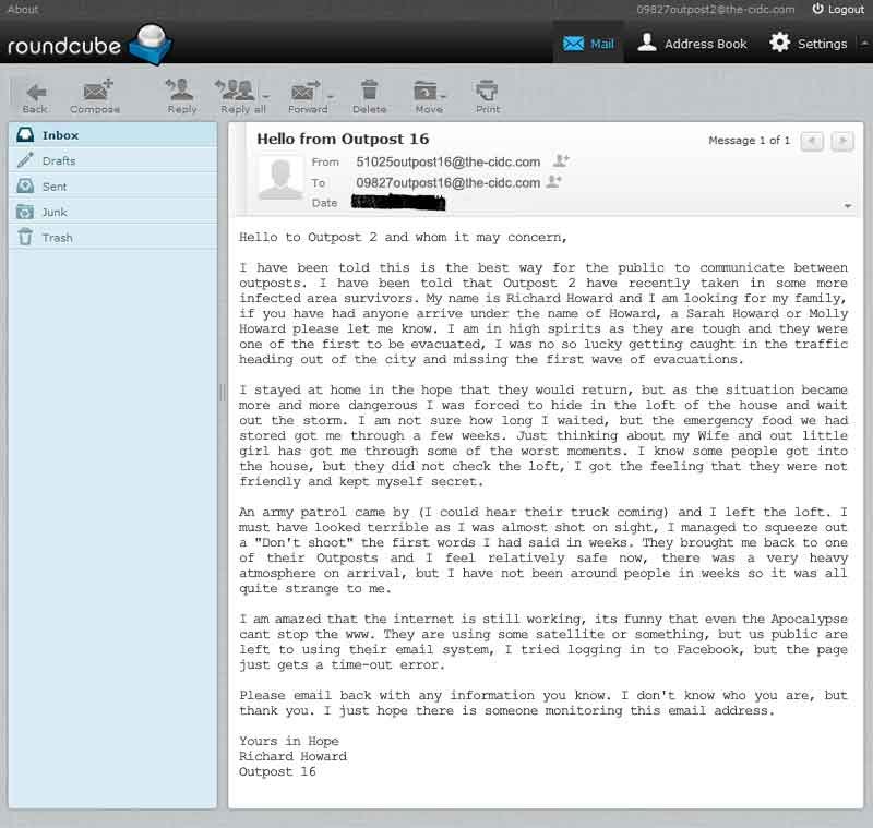 This is an email we intercepted coming from the base to another Outpost. This was sent by a recent member of the public who had taken residence in Outpost 16. Much of this is trivial, but it leads us to the second email where Richard Howard gives us an insight into the events at the Outpost 16 Facility.